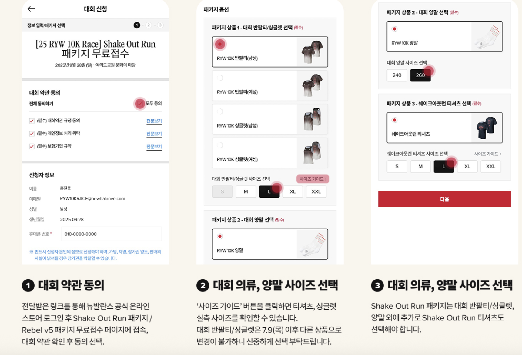 접수 페이지에서는 의류 옵션(싱글렛 or 반팔 티셔츠)과 양말 사이즈를 직접 선택할 수 있어요.  선택한 의상은 동일 라인 내에서만 변경 가능하다는 점 꼭 알아두세요. 반팔 → 반팔 사이즈 변경은 가능하지만, 반팔 → 싱글렛은 불가능하다고 해요.